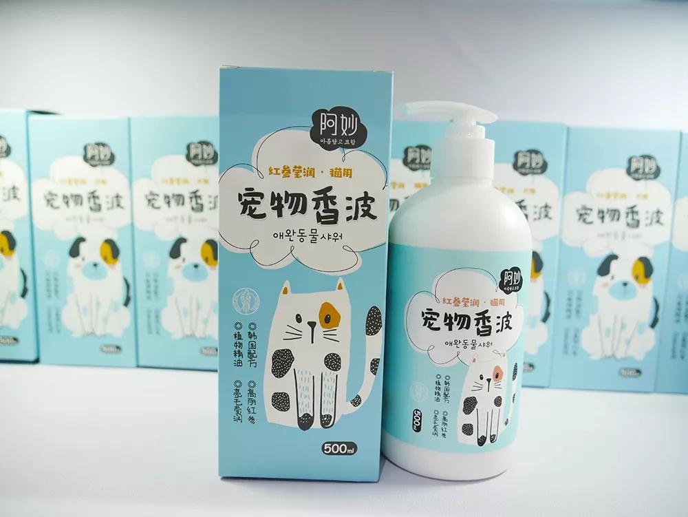 “阿妙”产品:犬/猫宠物香波(红参莹润、除虫止痒),护毛素,犬/猫消毒液,浓缩消毒液。